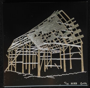 This series of aluminum painting makes use of reclaimed metal siding which is cut, carved and layered into a mosaic of texture arid colour. The Sacred Arboreal Portrait Project (SAPP) is an on going body of work which aims at historically documenting specific trees who share their space with the manufactured landscape/cityscape. It is that which happens at the meeting of the natural and the constructed that Hind examines.