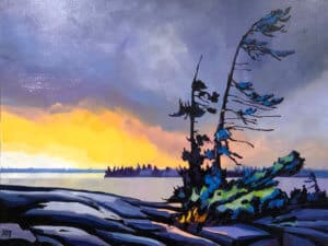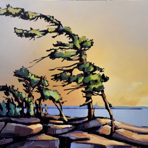 Not growing up here in Canada, he was not schooled on the art styles of the Canadian, Group Of Seven. So the reference to the windswept tree is more of a passionate interpretation of the beauty and rugged contrast of the landscape. He also feels is "push and pull" immigration to Canada has made him look and feel like the trees he paints.