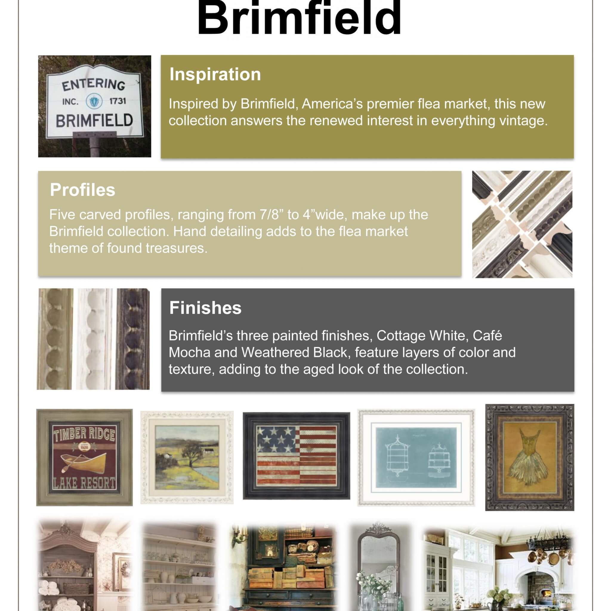 Five carved profiles, ranging from 7/8” to 4” wide, make up the Brimfield collection. Hand detailing adds to the flea market theme of found treasures.