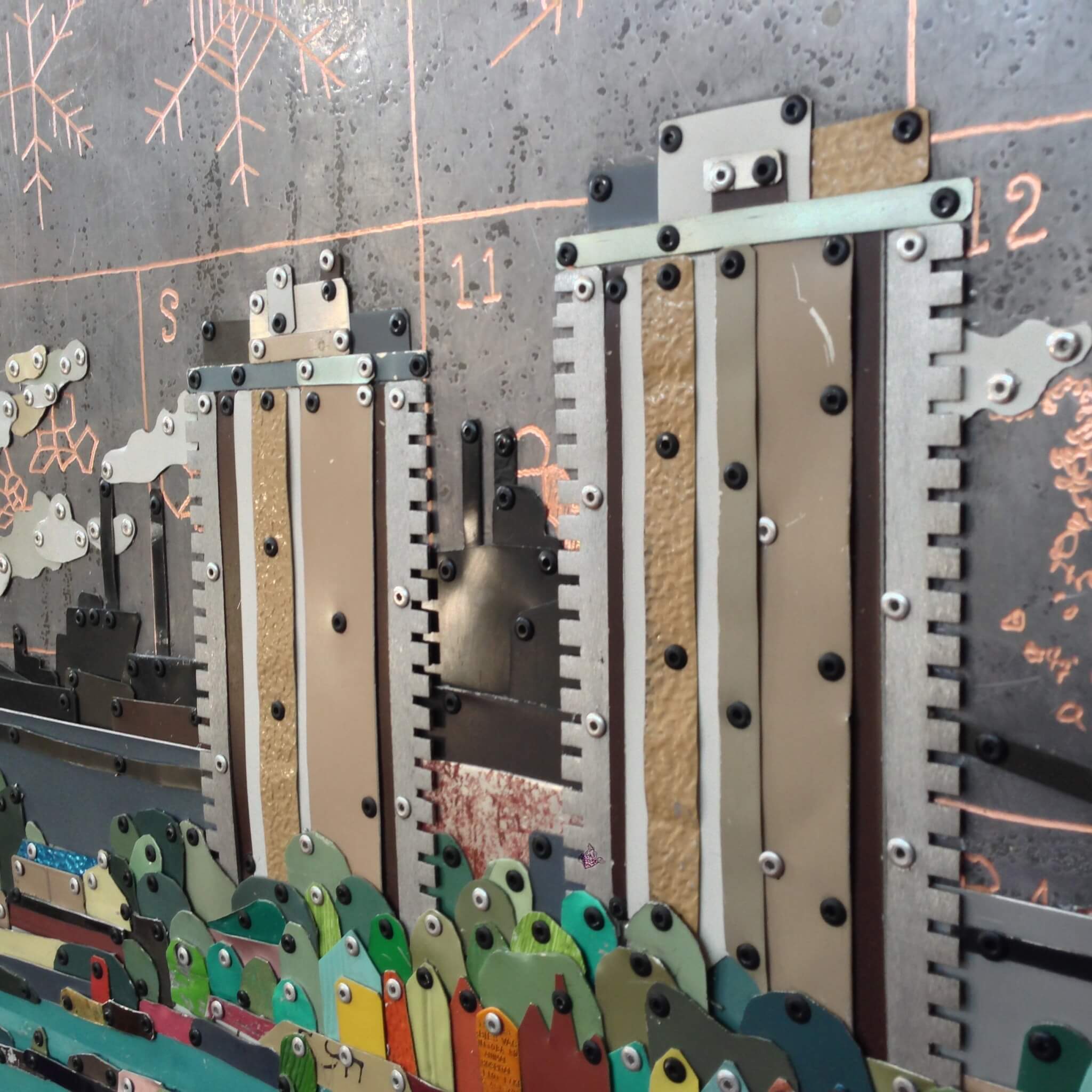 Repurposed aluminum collage, depicting contrasting layers of Hamilton Bay revitalization, aging industrialization and the changing environment.