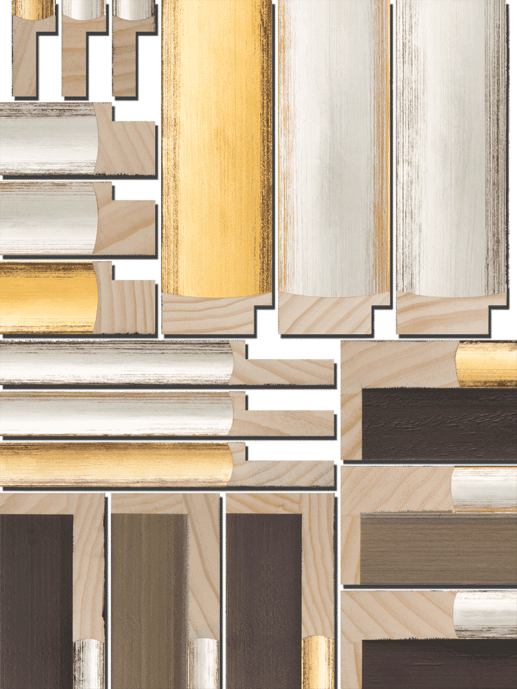 An Innovative Collection Pairing Hand-Leafing & Rustic Wood Finishes ideal for picture framing.